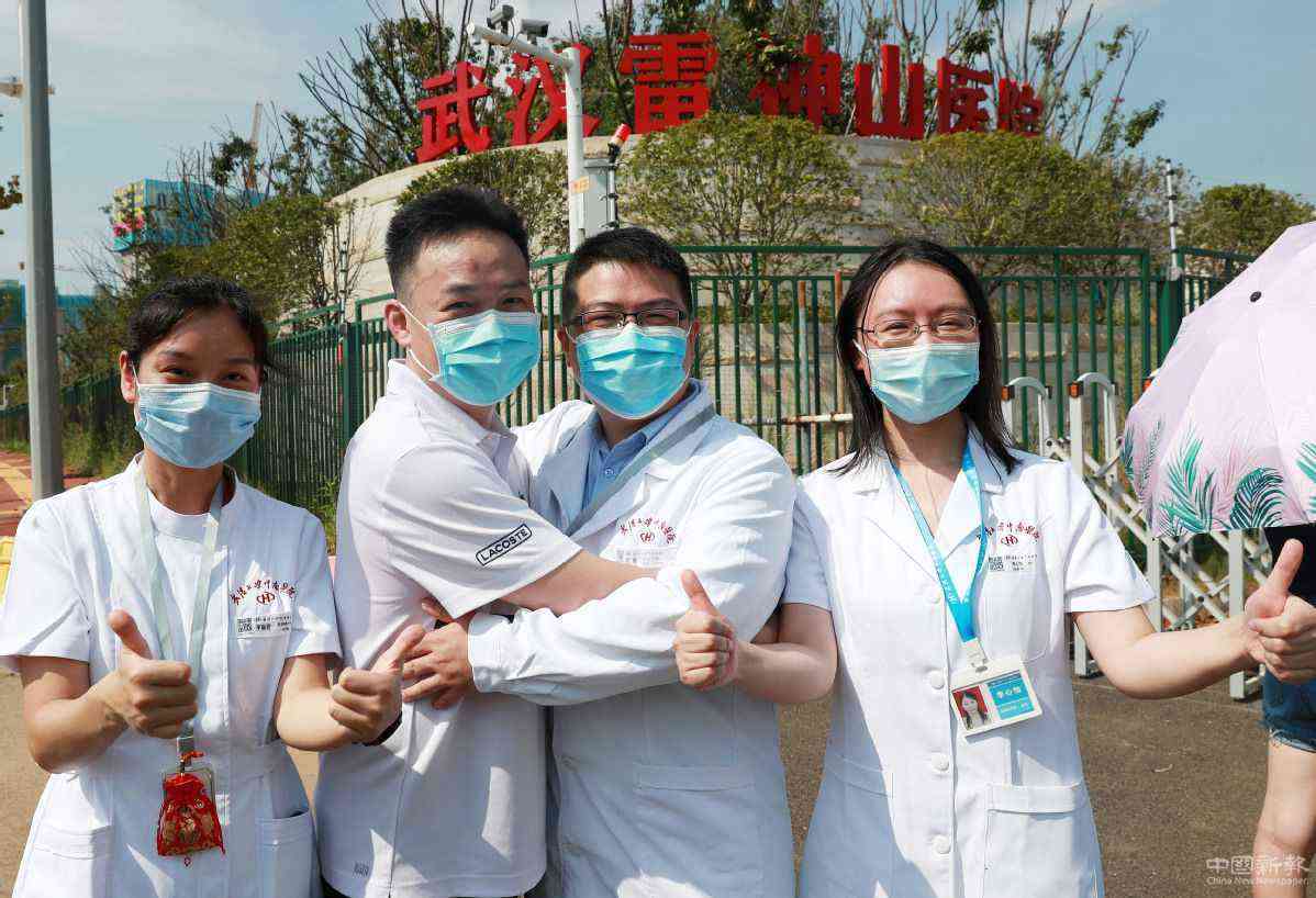 8月19日,在武漢雷神山醫(yī)院,新冠肺炎康復(fù)者唐某(左二)擁抱醫(yī)治自己的武漢大學(xué)中南醫(yī)院主治醫(yī)生項(xiàng)輝,這是唐某出院后 兩人首次重逢。(趙軍 攝)