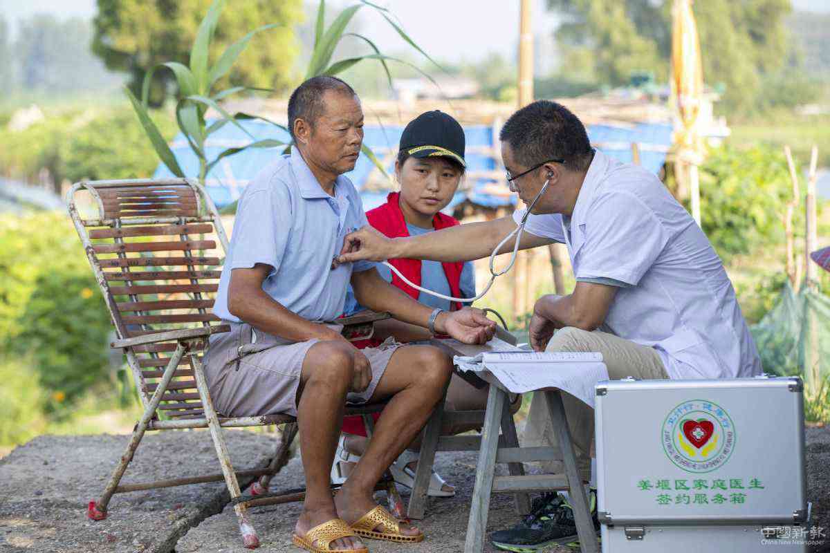 8月19日,江蘇省泰州市海陵區(qū)華港鎮(zhèn)下溪村村醫(yī)潘應(yīng)華為健康扶貧對象67歲的劉莊村村民潘圣年進(jìn)行體檢。(湯德宏 攝)