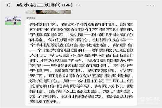 專題課結(jié)束之后,劉芬老師在班級(jí)群給孩子們寫了一段話:“在這個(gè)特殊的時(shí)期,原本應(yīng)該坐在教室的我們不得不對(duì)著電子屏幕學(xué)習(xí),這是一種前所未有的體驗(yàn),你們是幸福的,生活在這樣一個(gè)科技發(fā)達(dá)的信息化社會(huì),背后有一個(gè)強(qiáng)大的祖國和一群勇敢無私的人們。今天差不多是中考百日倒計(jì)時(shí),作為初三學(xué)子,我們更加要從中學(xué)到一些超越課本的知識(shí),要嚴(yán)于律己、腳踏實(shí)地、志存高遠(yuǎn)、心系天下。可能以前的你還有很多遺憾,沒關(guān)系的。第一次擔(dān)任初三班主任的我和你們共同學(xué)習(xí)、共同成長。我相信,疫情馬上會(huì)過去。為了夢(mèng)想、為了未來,我們好好努力,終會(huì)迎來春暖花開。”