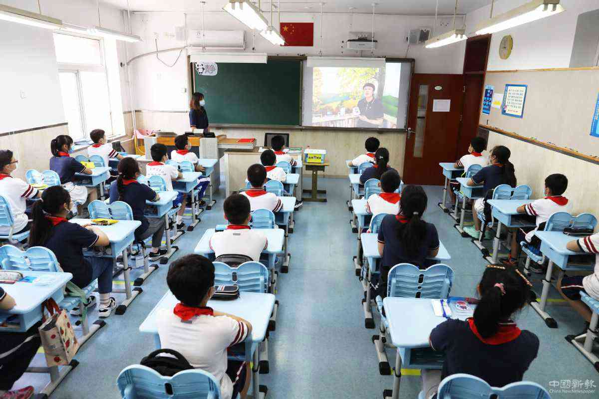 6月1日,在北京對(duì)外經(jīng)濟(jì)貿(mào)易大學(xué)附屬小學(xué),學(xué)生們觀看校長(zhǎng)王紅錄制的視頻開學(xué)第一課。 中國(guó)日?qǐng)?bào)記者 朱興鑫 攝