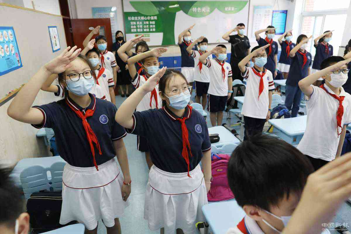 6月1日,北京對(duì)外經(jīng)濟(jì)貿(mào)易大學(xué)附屬小學(xué)舉行網(wǎng)上升旗儀式,學(xué)生們?cè)诮淌依锵驀?guó)旗敬少先隊(duì)禮。 中國(guó)日?qǐng)?bào)記者 朱興鑫 攝