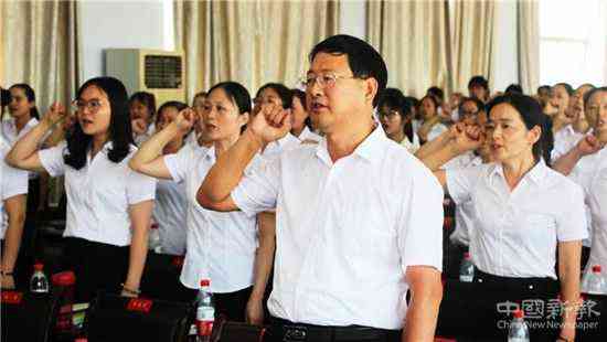 最后,6位今年新入職的新教師與臨澧實(shí)小全體教師一起在國(guó)旗下莊嚴(yán)宣誓,鏗鏘有力的誓言在老師們的耳畔回蕩,更在老師們心間激起一陣陣共鳴。