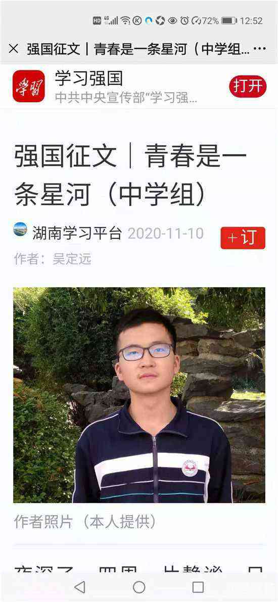 中國(guó)新報(bào)(特約記者  謝樂夫 通訊員 周中元 熊程)11月15日,從益陽(yáng)市教育局獲悉,沅江三中2002班吳定遠(yuǎn)同學(xué)在學(xué)習(xí)強(qiáng)國(guó)征文活動(dòng)中憑著一篇《青春是一條星河》的文章登上學(xué)習(xí)強(qiáng)國(guó)平臺(tái),此文,自11月10號(hào)在湖南學(xué)習(xí)平臺(tái)發(fā)表以來,五天時(shí)間,點(diǎn)擊量就達(dá)57419次,受到益陽(yáng)市教育局的充分肯定與點(diǎn)贊推廣。