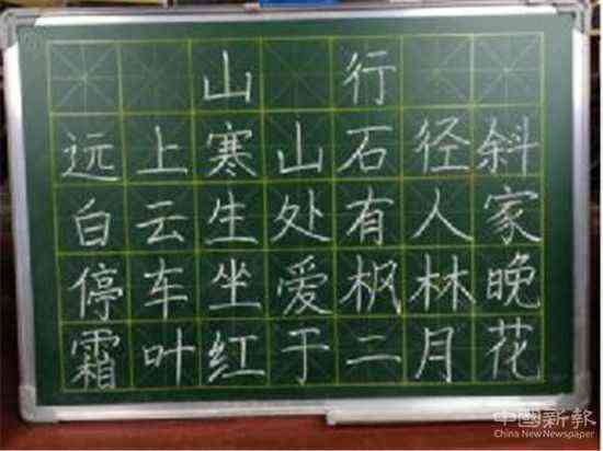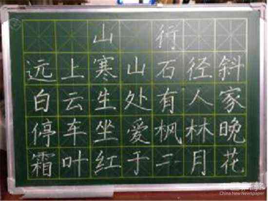 每人一塊小黑板,一根白粉筆,一首由教師代表抽取了一篇唐代杜牧的七言古詩(shī)《山行》,集體限時(shí)創(chuàng)作完成。