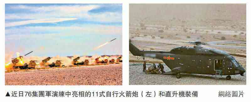 圖:近日76集團(tuán)軍演練中亮相的11式自行火箭炮(左)和直升機(jī)裝備\網(wǎng)絡(luò)圖片
