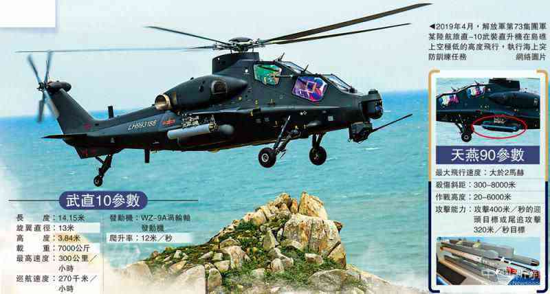 此次訓(xùn)練首次展示了武直-10仰射天燕-90導(dǎo)彈。武直-10利用島礁,低空隱蔽接近目標(biāo)并迅速佔(zhàn)領(lǐng)攻擊陣位,採取大仰角發(fā)射天燕-90,越過島礁,對靶標(biāo)進(jìn)行精確打擊。而此前武裝直升機(jī)大多採用水平直射或略微傾角的方式實(shí)施攻擊。大仰角發(fā)射顯示了全向攻擊能力。