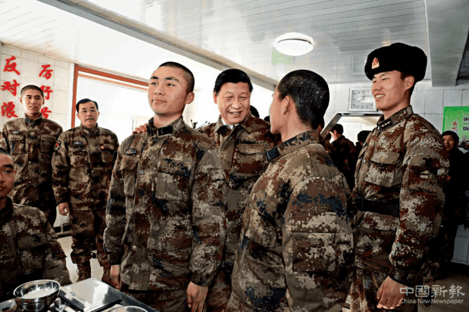 2014年1月26日,習近平主席在內(nèi)蒙古軍區(qū)邊防某團一連食堂,親切地拍著新兵劉博陽(前左一)、余兵(前左三)的肩膀,詢問他們是哪里人,連隊飯菜是否可口