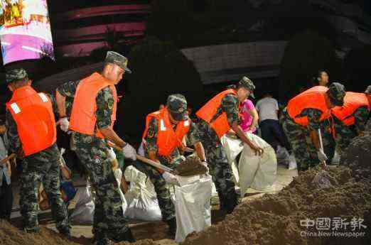 在重慶江北區(qū)郭家沱街道,武警官兵裝填沙袋。黃葉春 攝