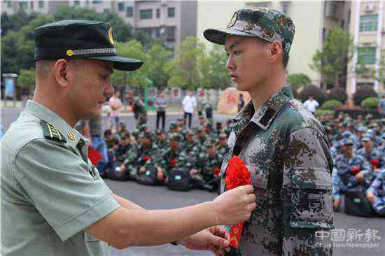 (圖為:縣人武部部長(zhǎng)歐陽(yáng)石林給新兵陸藝戴上光榮花)