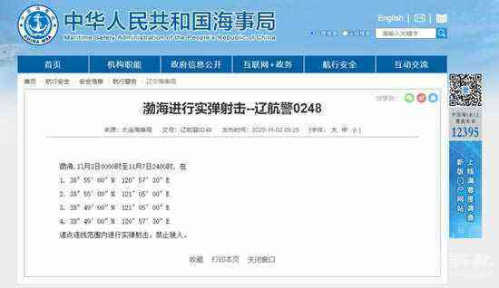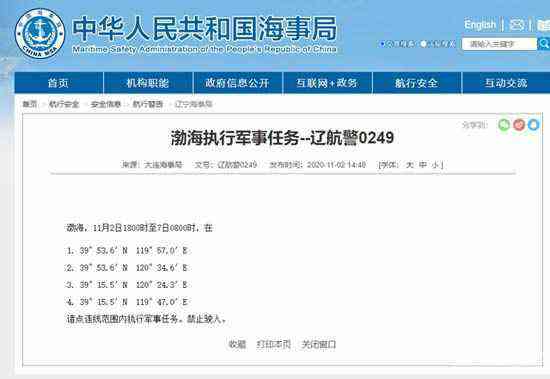 大連海事局11月2日發(fā)布《渤海進(jìn)行實(shí)彈射擊——遼航警0248》:11月3日至7日,渤海諸點(diǎn)連線范圍內(nèi)進(jìn)行實(shí)彈射擊,禁止駛?cè)??!恫澈?zhí)行軍事任務(wù)——遼航警0249》:11月2日,渤海諸點(diǎn)連線范圍內(nèi)執(zhí)行軍事任務(wù),禁止駛?cè)搿?/p>