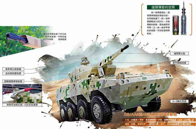 中國(guó)自主研發(fā)的CS/AA5型40毫米埋頭彈突擊炮,所發(fā)射的埋頭彈以小口徑實(shí)現(xiàn)了大威力,在體積和重量減輕30%的同時(shí),與同口徑的傳統(tǒng)彈藥相比,穿甲能力卻提高40%,彈芯以4倍音速?zèng)_向目標(biāo),同時(shí)高達(dá)上千攝氏度的碎片向四周造成密集殺傷,是打擊重型裝甲車和主戰(zhàn)坦克等地面重裝甲力量的新型利器。