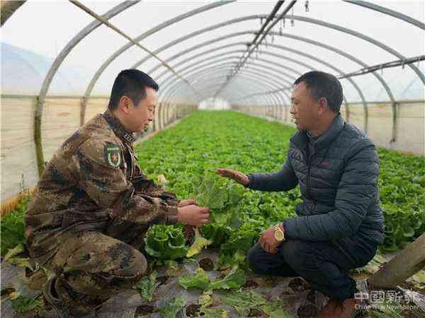 昆明市尋甸縣人武部政委方振宇向七星村種植大戶(hù)常民冬了解生菜種植銷(xiāo)售情況。張軍 攝