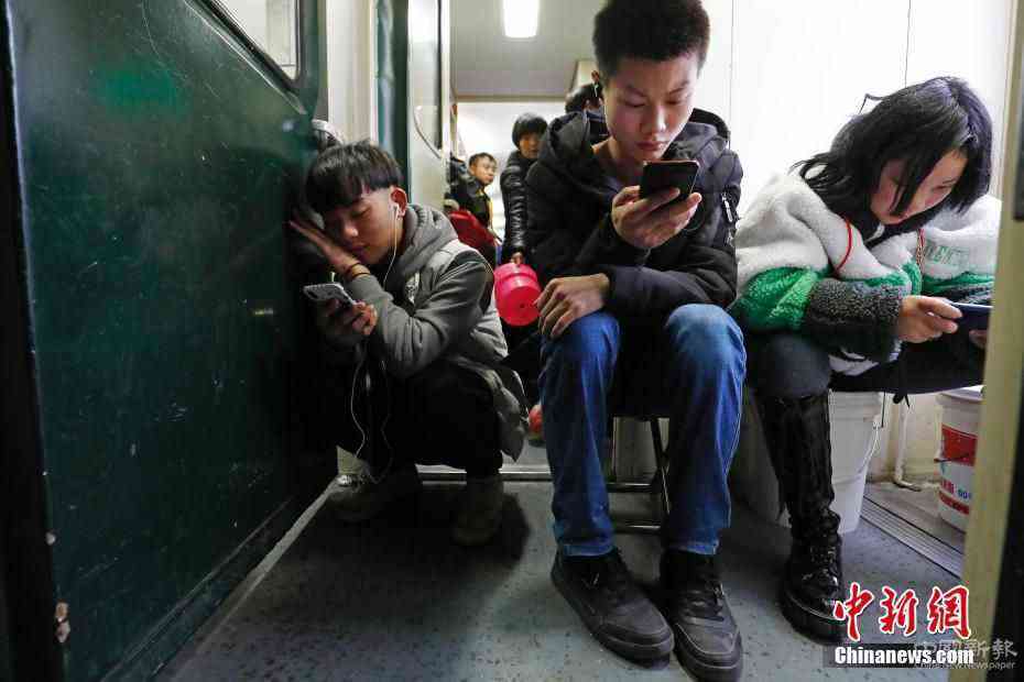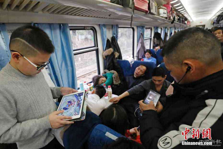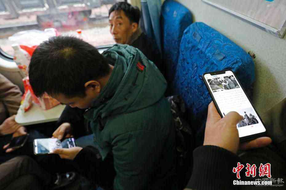 1月18日,在上海開往成都的K4663次列車上,旅客們正通過手機、iPad等移動設(shè)備,度過長達42小時的回家路。2020年春運中,平均時速120公里的綠皮車依然承擔(dān)著巨大任務(wù)。中新社記者 殷立勤 攝