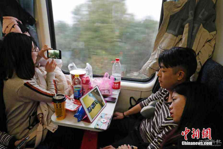 圖為旅客在車廂內(nèi)與家人視頻聊天。中新社記者 殷立勤 攝