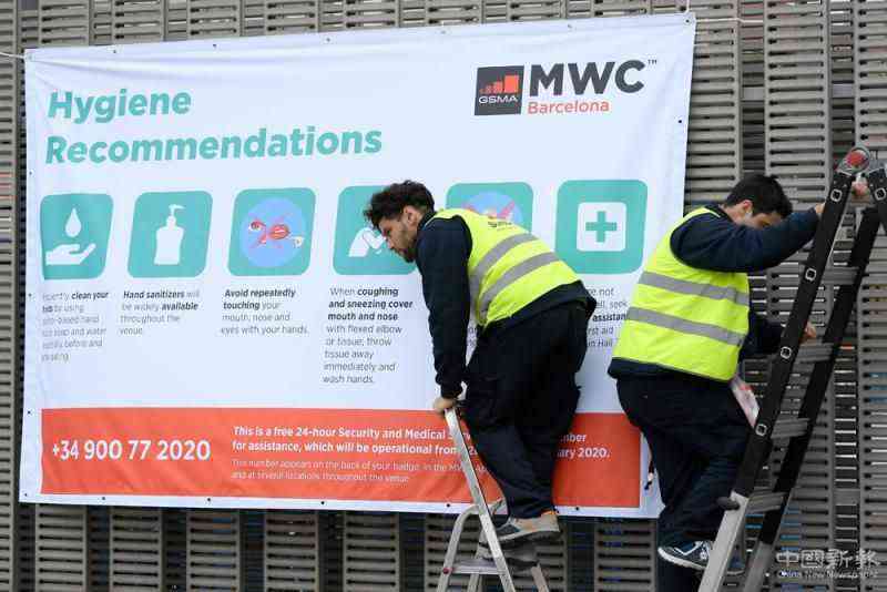 圖:工人12日在MWC場(chǎng)館外懸掛有關(guān)衛(wèi)生建議的橫幅\法新社