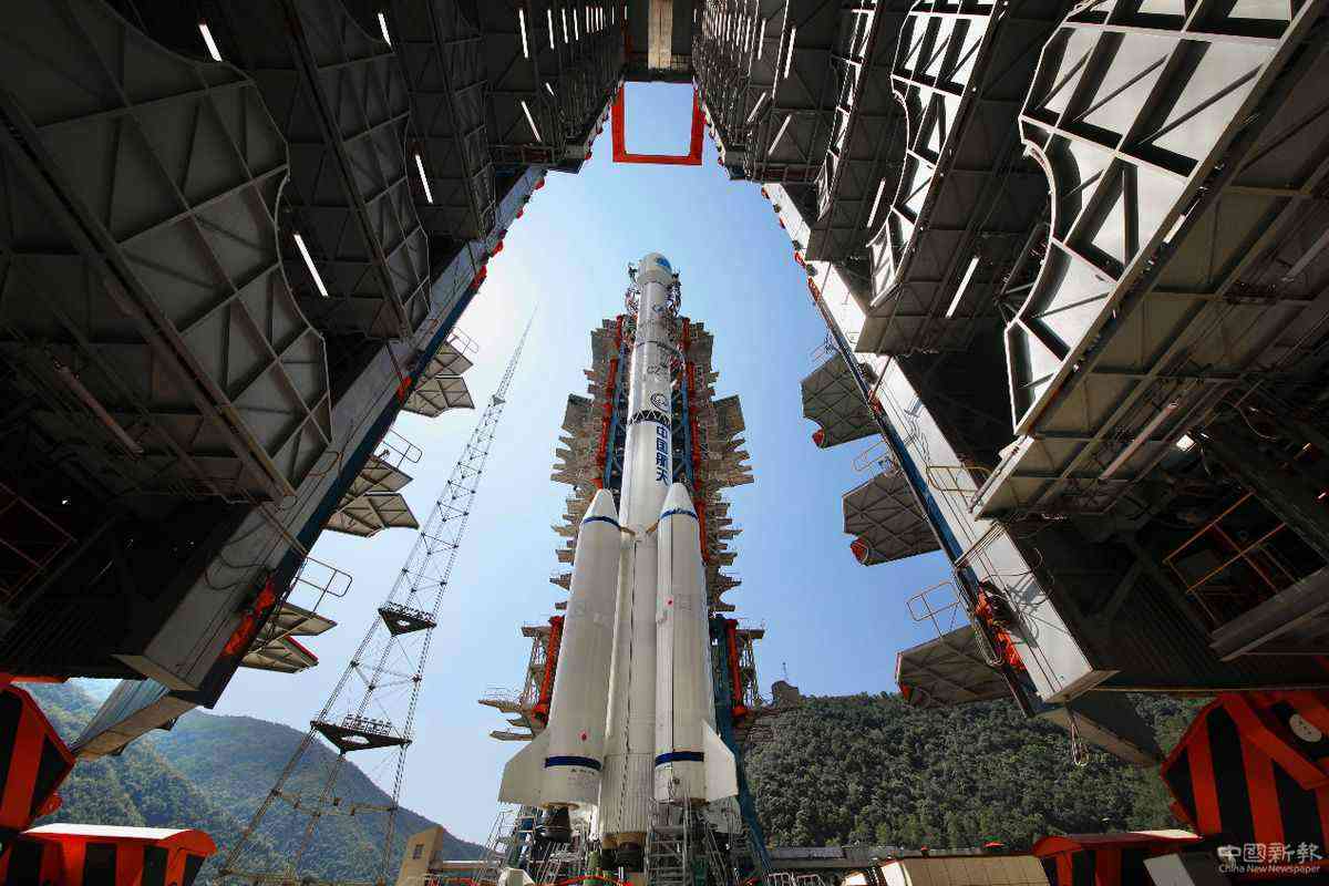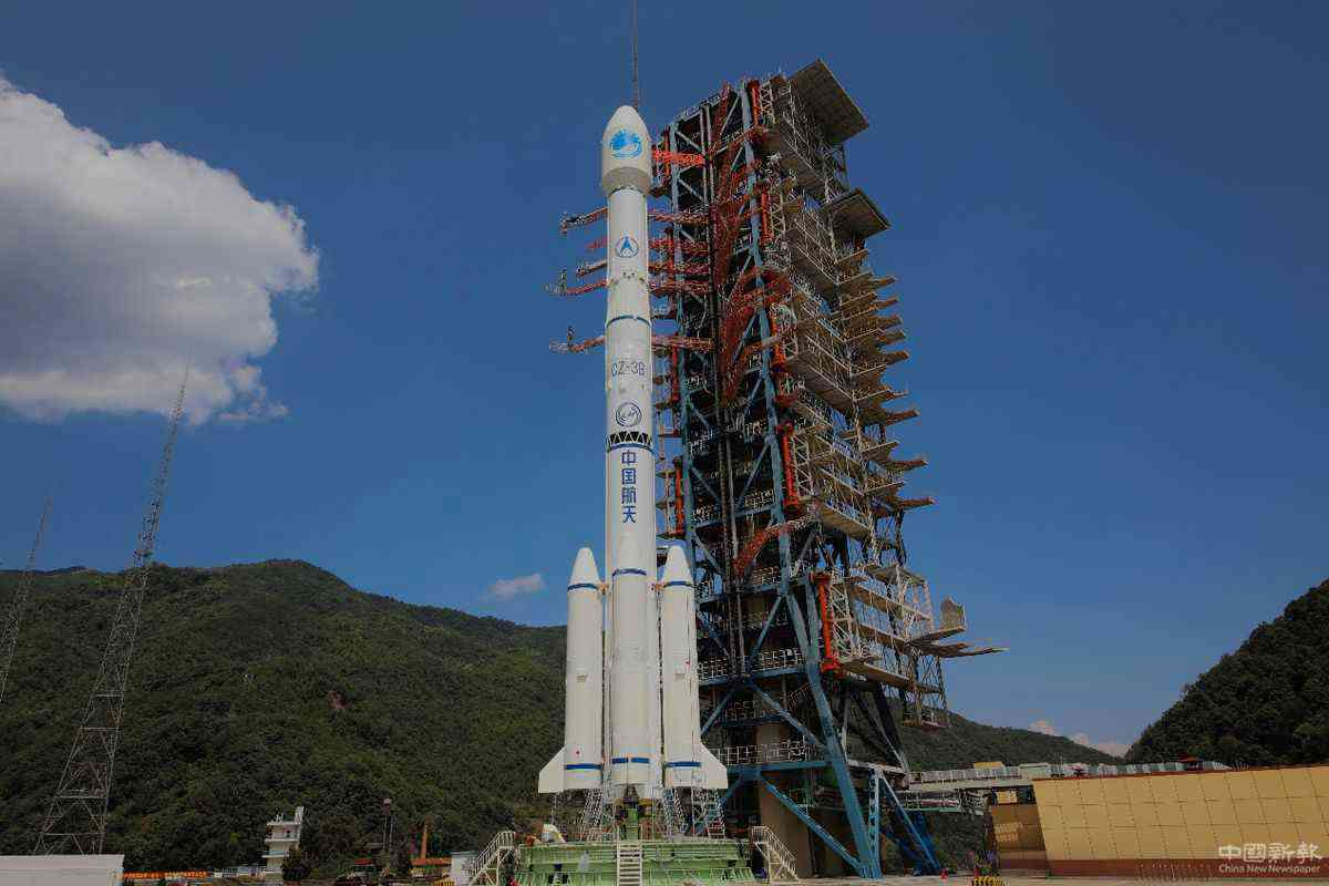 執(zhí)行發(fā)射任務(wù)的長(zhǎng)征三號(hào)乙運(yùn)載火箭矗立在西昌衛(wèi)星發(fā)射中心的塔架上。航天科技集團(tuán)一院供圖