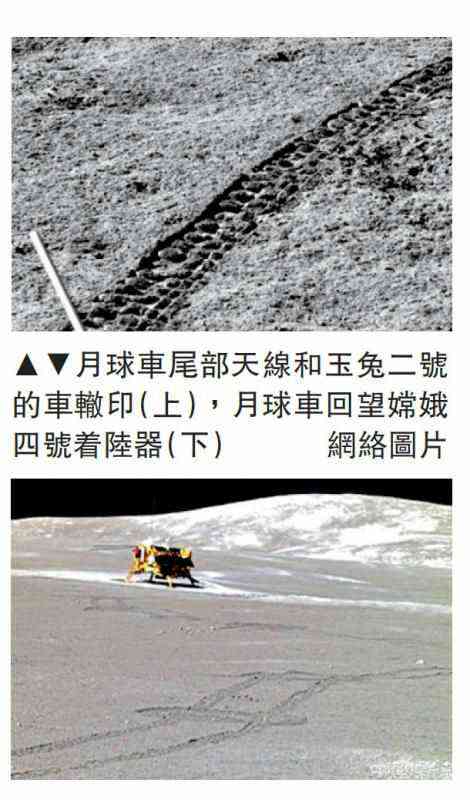 圖:月球車尾部天線和玉兔二號(hào)的車轍印(上),月球車回望嫦娥四號(hào)著陸器(下)\網(wǎng)絡(luò)圖片