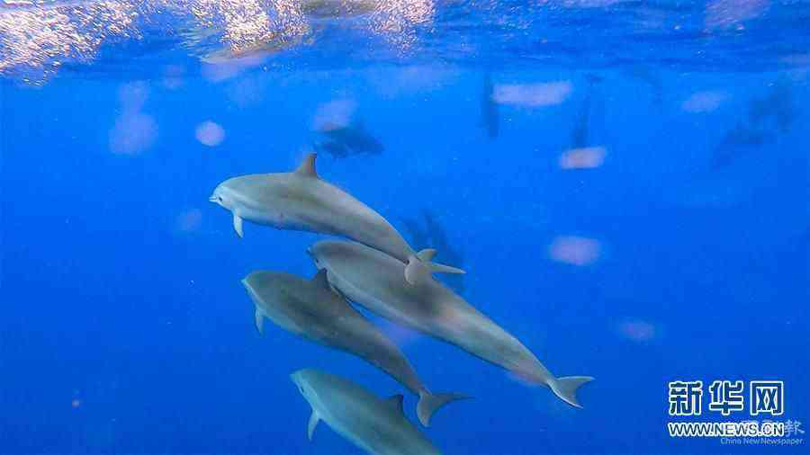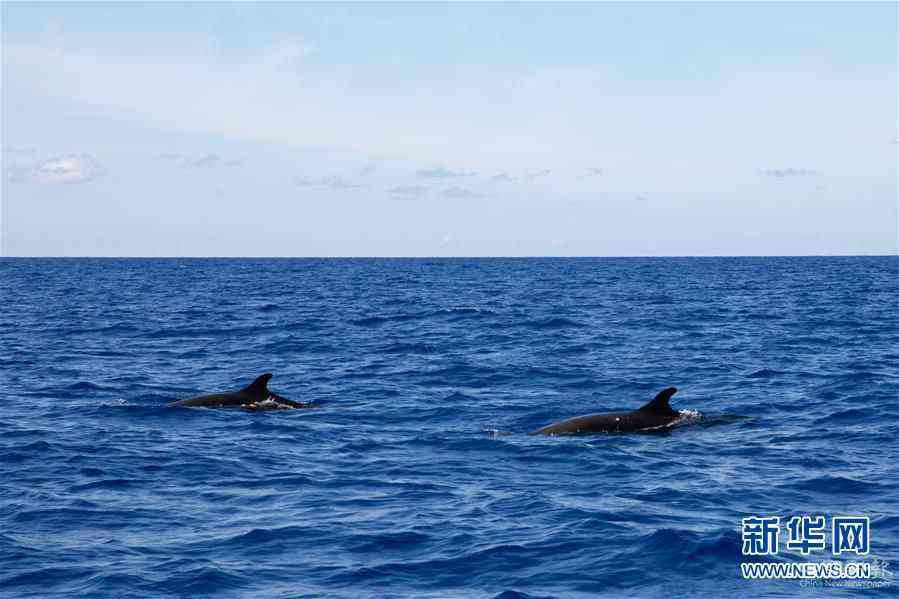 7月20日在南海某海域拍攝的弗氏海豚與短肢領(lǐng)航鯨共游場景,后面的黑影為短肢領(lǐng)航鯨。 新華社記者 張麗蕓 攝 圖片來源:新華網(wǎng)