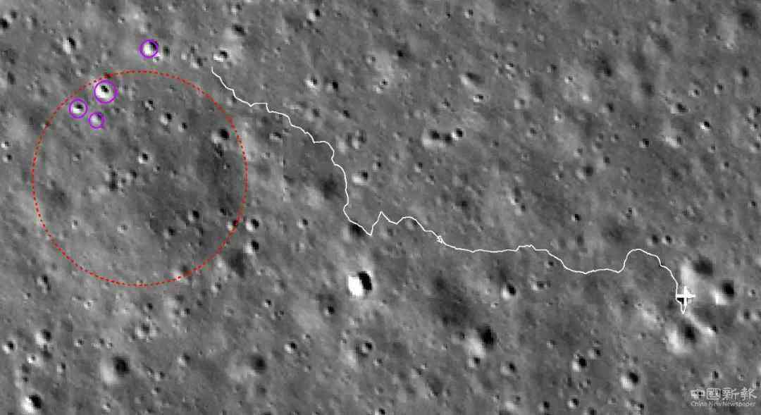 △去往最近反射率較亮的撞擊坑(紫色圓圈區(qū)域),紅圈為巖塊位置
