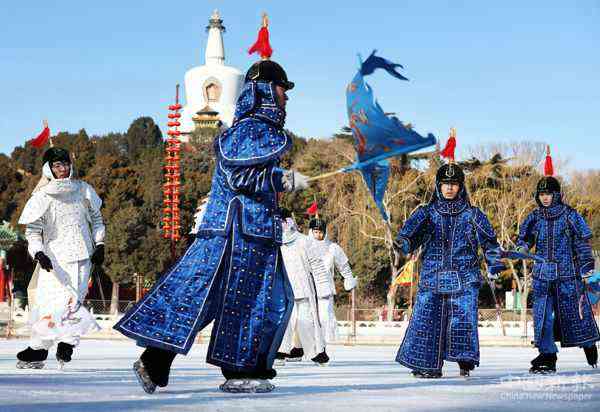 1月13日,在北京北海公園,表演者穿著清朝八旗服飾進(jìn)行皇家“冰嬉”表演。 中國(guó)日?qǐng)?bào)記者 朱興鑫 攝