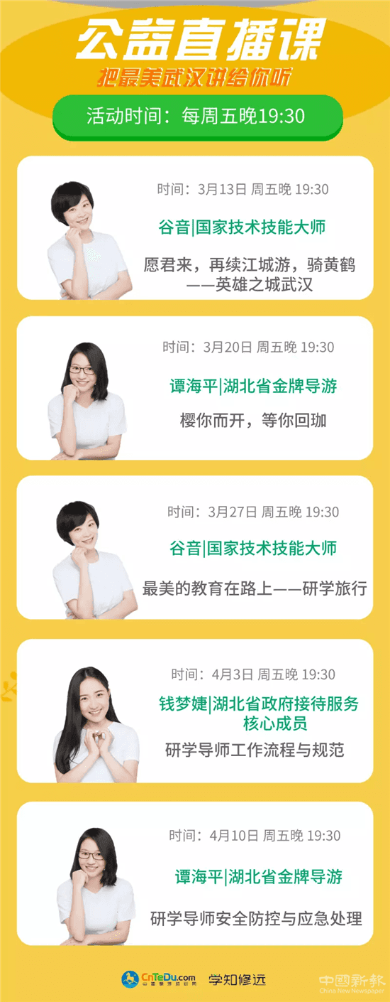 一批骨干旅游企業(yè)精心組織在線導(dǎo)游培訓(xùn)。武漢學(xué)知悟達(dá)國際旅行社有限公司推出“我把最美的武漢講給你聽”在線公益講座活動,由谷音、楊潔、譚海平三位國家級金牌導(dǎo)游輪流開講。