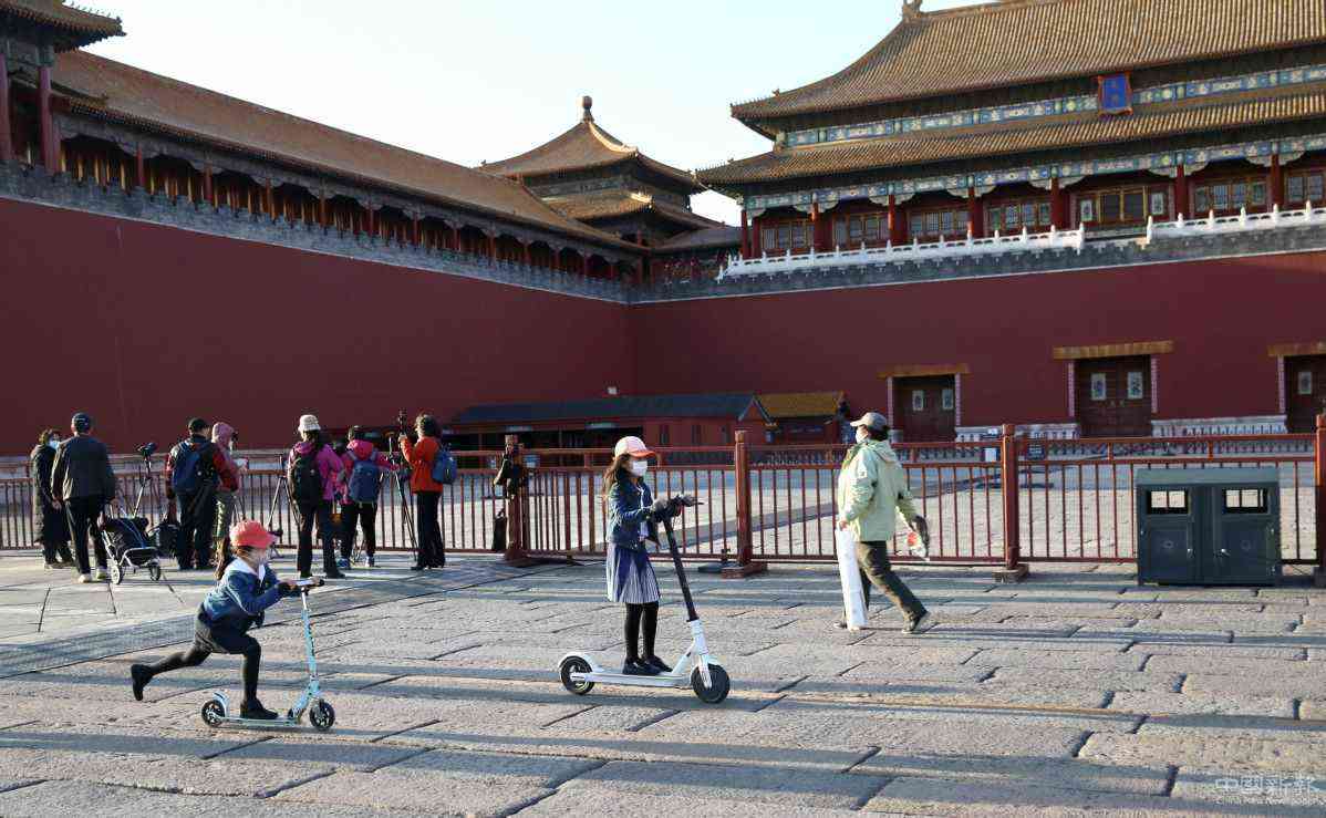 3月28日,小朋友們在故宮午門前玩滑板。(中國日報記者 鄒紅 攝)