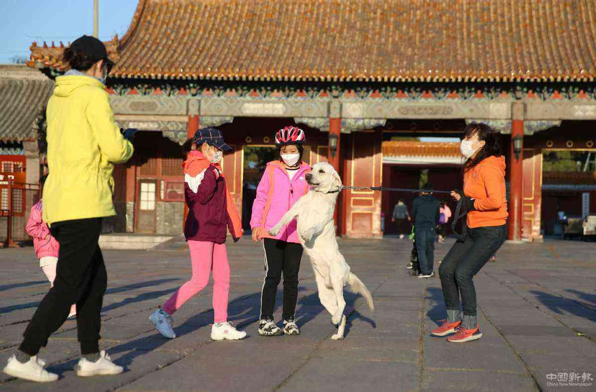 3月28日,小朋友們在故宮午門前和小狗玩耍。(中國日報記者 鄒紅 攝)
