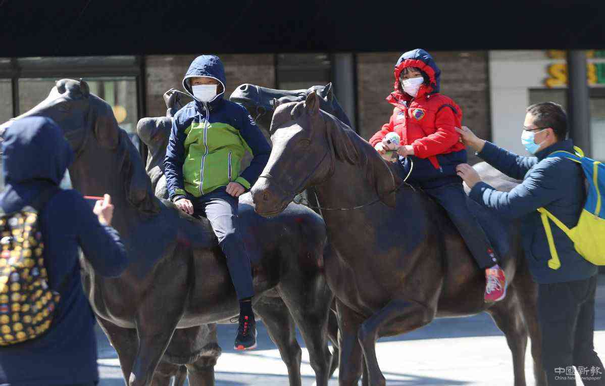 3月27日,八達(dá)嶺長城門外,小朋友們和雕塑馬合影。(中國日報記者 鄒紅 攝)