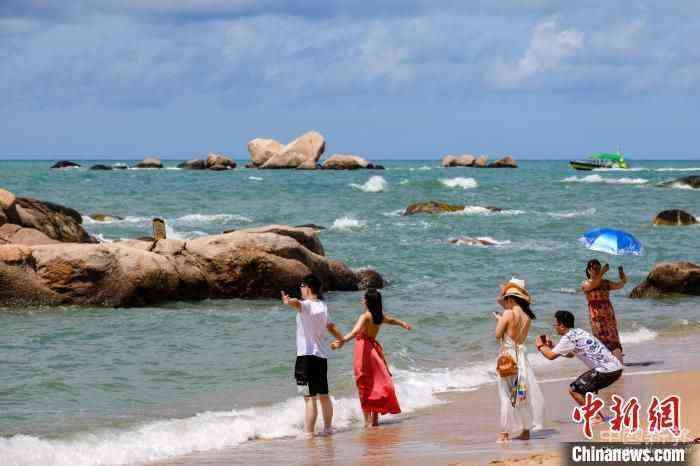 游客在天涯海角的海邊沙灘“擁抱大海”。范勇 攝