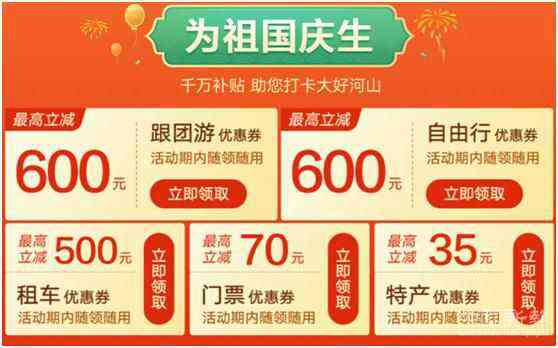 攜程于9月22日至10月8日啟動“十一”大促活動,跟團游產(chǎn)品領(lǐng)券最高立減600元;自由行產(chǎn)品最高立減600元;租車最高立減500元。門票立減最高70元,旅游特產(chǎn)立減35元,各業(yè)務(wù)領(lǐng)券立減最高超過1800元。