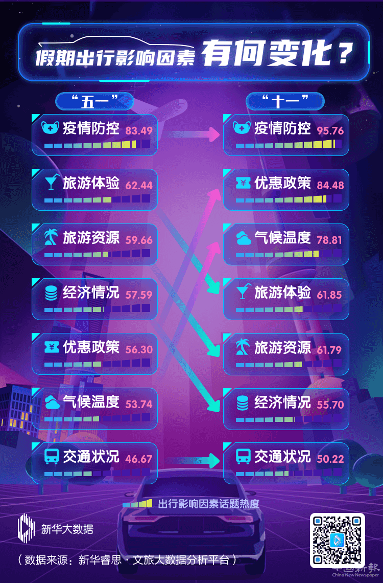 今年黃金周,消費者偏好又發(fā)生了哪些變化呢?新華睿思數(shù)據(jù)顯示,疫情防控、旅游體驗、優(yōu)惠政策、氣候溫度、交通狀況等是影響居民“十一”出行的重要因素。其中,做好個人出游安全防護(hù)工作一直都是游客出行最為關(guān)注的要點。各地為刺激旅游市場、促進(jìn)當(dāng)?shù)叵M所出臺的一系列優(yōu)惠政策也使游客的出行更具有傾向性,“優(yōu)惠政策”相關(guān)話題討論熱度上升至84.48,較“五一”期間提升50.13%。此外,“十一”黃金周正處于天氣溫度變化較頻繁時期,“氣候溫度”也成為游客出行的重點關(guān)切因素。