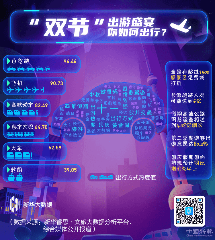 據(jù)悉,全國有超過1500家景區(qū)免費或打折、國慶假期旅游人次可能達(dá)到6億、高速公路網(wǎng)總流量將達(dá)到4.08億輛次、國慶假期國內(nèi)航班預(yù)計同比增11%以上……節(jié)前一系列刺激消費政策與假期出游預(yù)測數(shù)據(jù),向人們描繪了熱鬧非凡的“雙節(jié)”旅游盛宴。同時,相較“五一”假期,“十一”出行方式將更趨多樣,遠(yuǎn)途旅行將明顯增多。新華睿思數(shù)據(jù)顯示,綜合便捷性、安全性、隱私性、舒適性等因素考慮,“自駕游”依舊是游客最為青睞的出行方式,熱度值高達(dá)94.46。此外,消費者對飛機(jī)、高鐵、大巴等公共交通選擇意愿均有所提高。