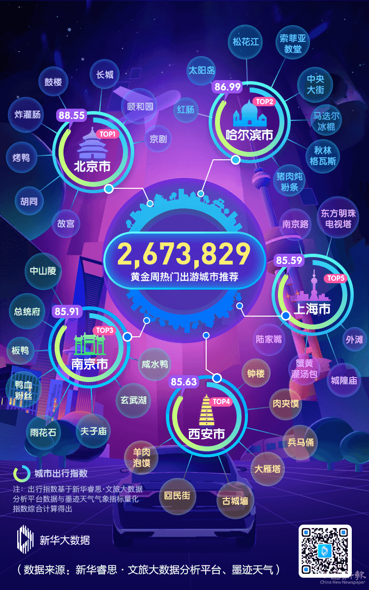 新華睿思將信息傳播數(shù)據(jù)與墨跡天氣氣象指標(biāo)量化指數(shù)進(jìn)行聚合分析,形成城市出行指數(shù)。分析結(jié)果顯示,北京、哈爾濱、南京、西安、上海是今年“十一”黃金周居民出行推薦度最高的5個城市,城市出行指數(shù)分別為88.55、86.99、85.91、85.63、85.59。
