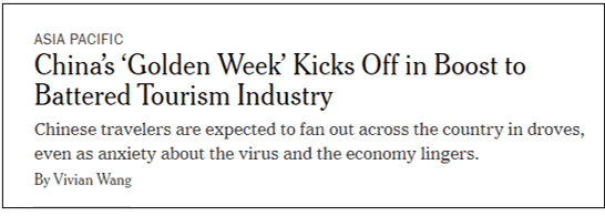 近日,美國(guó)《紐約時(shí)報(bào)》發(fā)表了一篇題為《中國(guó)“十一”黃金周提振遭受重創(chuàng)的旅游業(yè)》的報(bào)道。