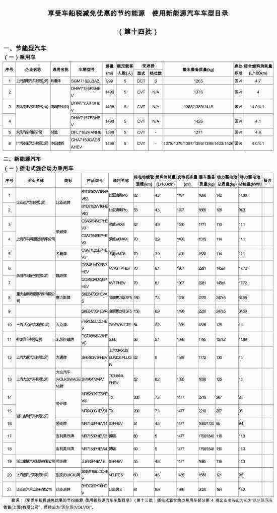 近日,工業(yè)和信息化部發(fā)布了關(guān)于對《享受車船稅減免優(yōu)惠的節(jié)約能源 使用新能源汽車車型目錄》(第十四批)(以下簡稱《目錄》)的公示?!赌夸洝凤@示,上汽通用、東風(fēng)本田、東風(fēng)汽車、廣汽本田共有4款節(jié)能型乘用車型進入該批次目錄;另有比亞迪、上汽、長城、一汽大眾等11家企業(yè)的新能源汽車產(chǎn)品入選。