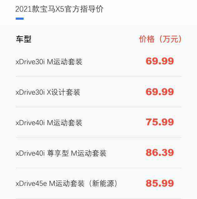 日前,我們從寶馬官方渠道獲悉,2021款寶馬X5 、X5新能源車型上市,售價為69.99-86.39萬元,據(jù)了解2021款X5相較現(xiàn)款車型在部分配置上有所改動,動力方面將搭載2.0T四缸渦輪增壓發(fā)動機與3.0T直列六缸渦輪增壓發(fā)動機,具體售價如下: