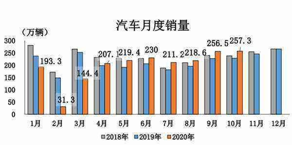 10月,汽車產(chǎn)銷分別完成255.2萬輛和257.3萬輛,環(huán)比分別增長0.9%和0.1%,同比分別增長11.0%和12.5%。截至本月,汽車產(chǎn)銷已連續(xù)7個月呈現(xiàn)增長,其中銷量已連續(xù)六個月增速保持在10%以上。