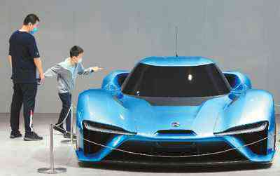 10月3日,江蘇省南京市,2020(第十九屆)南京國(guó)際汽車展覽會(huì),人們?cè)谖祦?lái)汽車展位前觀看展出的一款蔚來(lái)純電動(dòng)跑車。 |