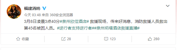福建省消防救援總隊(duì)官方微博消息,3月8日凌晨3點(diǎn)40分,泉州欣佳酒店救援現(xiàn)場傳來好消息,消防救援人員救出第45名被困人員。