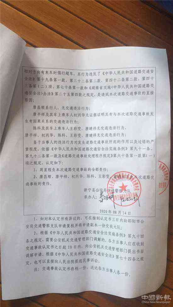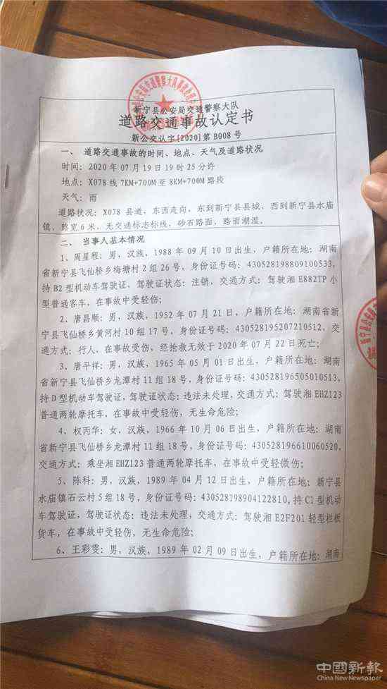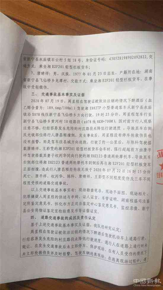 記者從8月5日新寧縣公安局交通警察大隊出具的道路交通事故認(rèn)定書了解到,2020年7月19日,周星程在無證且嚴(yán)重醉酒情況下(血乙醇合量為:189.6mg/100ml)駕駛湘E882TP小型普通客車從新寧縣水廟鎮(zhèn)沿X078線往新寧縣飛仙橋鄉(xiāng)方向行駛,19時25分許,周星程駕車行至新寧縣飛仙橋鄉(xiāng)黃河村10組路段,因?qū)η胺叫腥擞^察注意不夠,行經(jīng)容易發(fā)生危險的村莊路段未降低行駛速度,導(dǎo)致其車右側(cè)反光鏡部位將行人唐昌順撞倒,發(fā)生事故后,周星程沒有停車搶救傷員也沒有報警,而是駕車往縣城方向逃跑,行駛了約一公里后,與陳科駕駛搭唐晴祥、王彩雯的湘E2F201輕型欄板貨車會車時,強(qiáng)行起越前方由唐平祥駕駛搭載其妻子權(quán)丙華同向行駛的湘EHZ123普通兩輪摩托車,導(dǎo)致其車右側(cè)部位將湘EHZ123普通兩輪摩托車刮倒后,再與湘E2F201輕型欄板貨車正面相撞,造成行人唐昌順經(jīng)搶救無效于2020年7月22日16時15分許死亡、唐平祥,權(quán)丙華、陳科、唐晴祥、王彩受不同程度受仿及三車不同程度受損的道路交通事故。