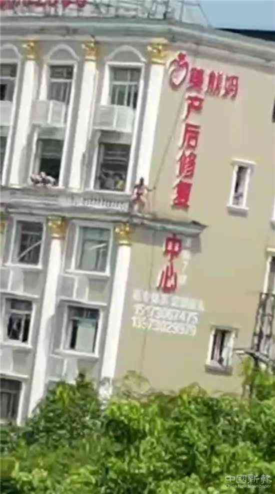 視頻顯示,一男子身穿內(nèi)褲在窗外邊沿爬行,隨后抓住線纜跳了下去,