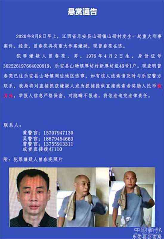 康樂瑩表示:不會放棄追究樂安縣公安局的瀆職問題。宜春市中級人民法院有關(guān)人員接收了起訴書等材料。 嫌犯曾春亮落網(wǎng) 2020年8月8日,江西樂安縣山碭鎮(zhèn)山碭村發(fā)生一起重大命案,康某夫婦身亡,一名7歲兒童重傷。