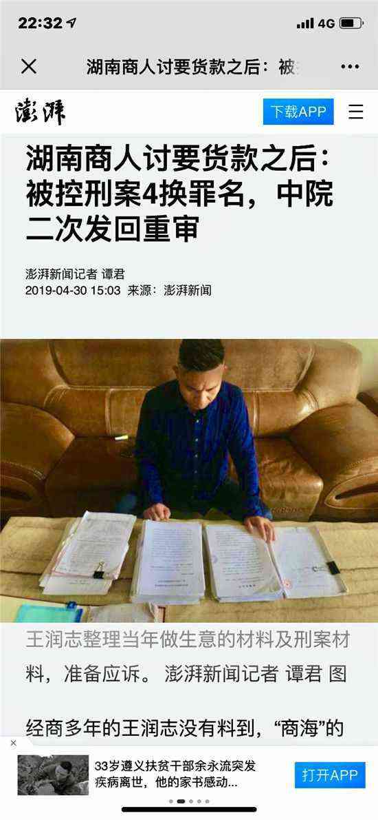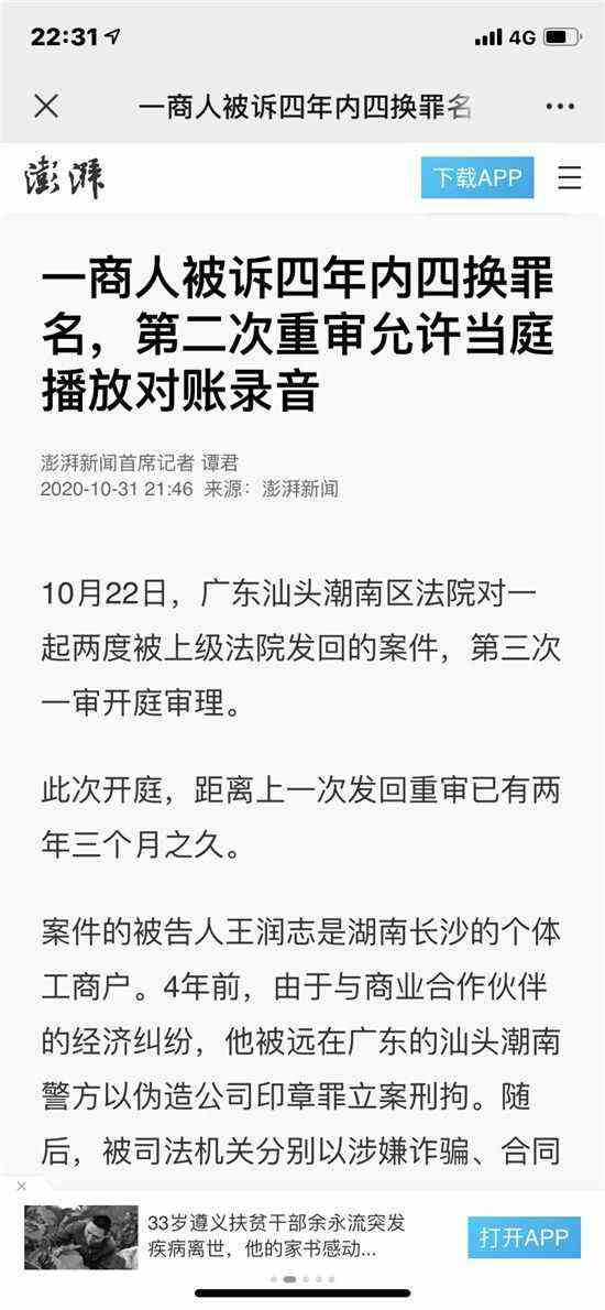 近日,長沙商人王潤志發(fā)來一份《汕頭民警余昱、許遵波徇私枉法,為幫助當?shù)厣倘颂觽?,將?jīng)濟糾紛人為制造成冤假錯案》求助信。澎湃新聞對王潤志信中的事件分別于2019年4月30日刊發(fā)《湖南商人討要貨款之后:被控刑案4換罪名,中院二次發(fā)回重審》(報道鏈接:https://m.thepaper.cn/newsDetail_forward_3336752)以及2020年10月31日刊發(fā)《一商人被訴四年內(nèi)四換罪名,第二次重審允許當庭播放對賬錄音》(報道鏈接:https://m.thepaper.cn/newsDetail_forward_9731362)等進行了詳實報道。