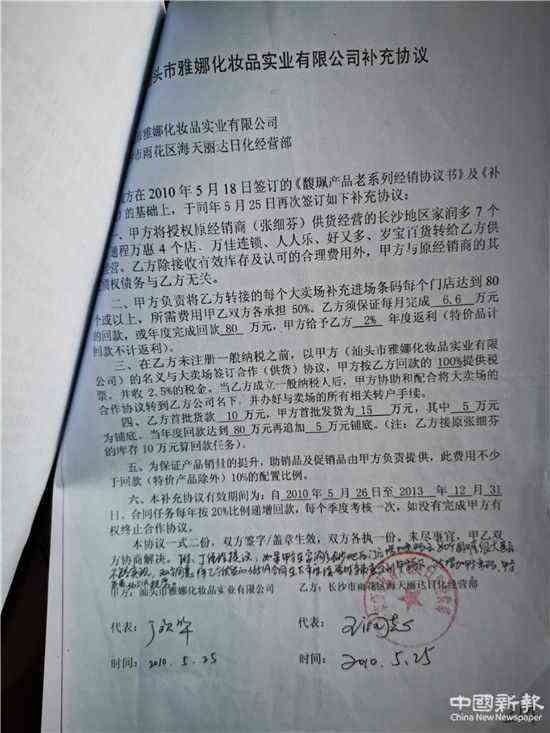 這次信中寫到,2010年5月25日,汕頭市雅娜化妝品實業(yè)有限公司(下稱“雅娜公司”)與長沙商人王潤志簽訂《補充協(xié)議》并授權王潤志將2011年度與家潤多超市3651A合同變更到了雅娜公司名下,變通增加了雅娜公司條碼。一年以后又與家潤多續(xù)簽了合同,且該合同原件由雅娜公司省區(qū)經(jīng)理丁歡華從家潤多簽領。
