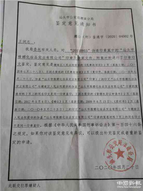 新的合議庭對王潤志的部分無罪證據(jù)進行司法鑒定:潮公(刑)鑒通字(2020)04002號鑒定意見通知書顯示:雅娜公司存在2套以上印章。