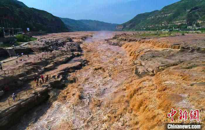 主副瀑布連成一片,游客在壺口瀑布岸邊觀賞游覽?!√m華 攝