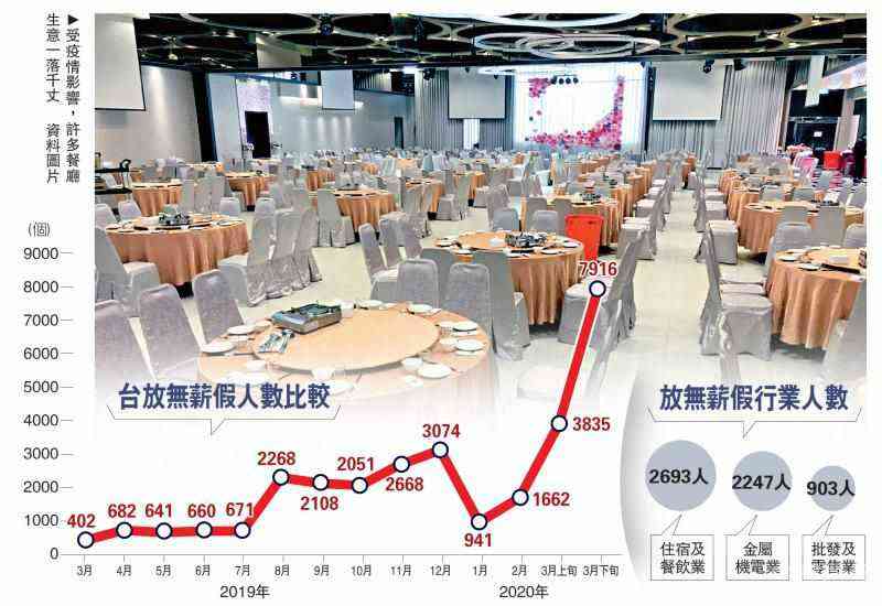 【大公報(bào)訊】綜合新華社及中通社報(bào)道:臺(tái)“勞動(dòng)部”4月1日表示,實(shí)施無薪假的事業(yè)單位共308家,人數(shù)7916人,半個(gè)月內(nèi)人數(shù)翻倍,更創(chuàng)2012年1月以來的新高。其中,以住宿及餐飲業(yè)高達(dá)2693人放無薪假最多,其次為金屬機(jī)電業(yè)2247人、批發(fā)及零售業(yè)903人;實(shí)施無薪假的企業(yè),也以住宿及餐飲業(yè)81家最多,其次為支援服務(wù)業(yè)63家、批發(fā)及零售業(yè)61家。各縣市中放無薪假人數(shù)以臺(tái)北2194人最多,其次是新北市1233人,兩個(gè)城市就佔(zhàn)了四成。