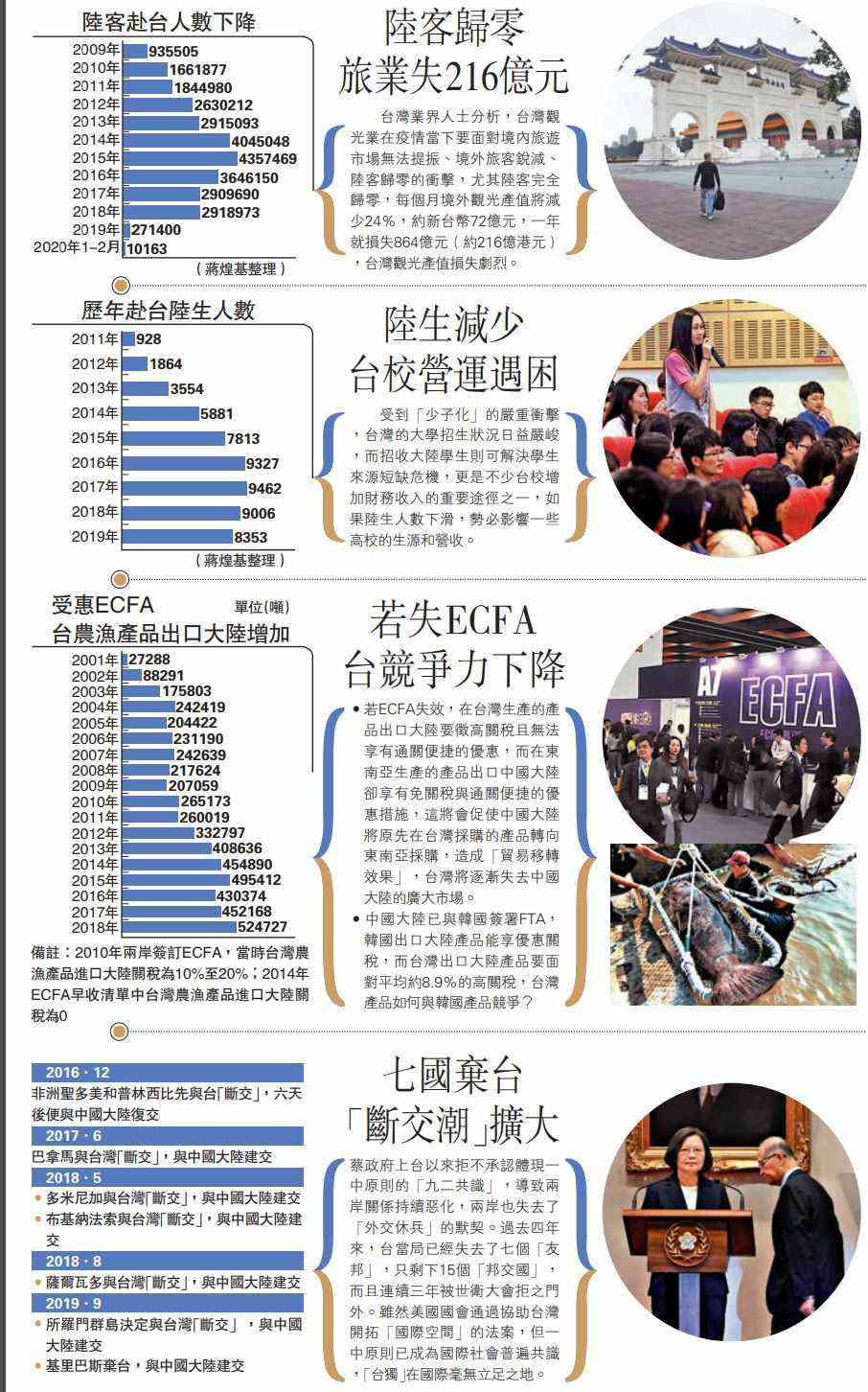 今年以來,民進(jìn)黨當(dāng)局借新冠肺炎疫情不斷抹黑大陸、制造矛盾,導(dǎo)致兩岸關(guān)系雪上加霜。去年8月起大陸方面已暫停大陸居民赴臺自由行,最近又暫停畢業(yè)生赴臺升學(xué)。兩岸學(xué)者指出,臺當(dāng)局想一邊搞“臺獨”、一邊賺大陸的錢,這是癡心妄想。自民進(jìn)黨蔡英文政府四年前上臺后,迄今不承認(rèn)體現(xiàn)一中原則的“九二共識”,導(dǎo)致兩岸關(guān)系持續(xù)惡化。緊張局勢大大降低陸客陸生的赴臺意愿。臺灣下一波還將失去什么?目前各界的焦點在已實施10年的兩岸經(jīng)濟(jì)合作框架協(xié)議(ECFA)。\大公報記者 何德花
