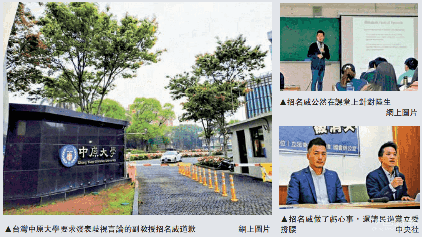 【大公報訊】綜合中通社及環(huán)球網(wǎng)報道:臺灣中原大學(xué)生物科技系副教授招名威早前在上課時提到“武漢肺炎”等字眼,引起陸生不滿,招名威又以充滿歧視言語攻擊陸生。