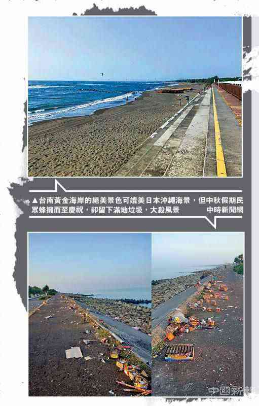圖:臺南黃金海岸的絕美景色可媲美日本沖繩海景,但中秋假期民眾蜂擁而至慶祝,卻留下滿地垃圾,大殺風景\中時新聞網(wǎng)